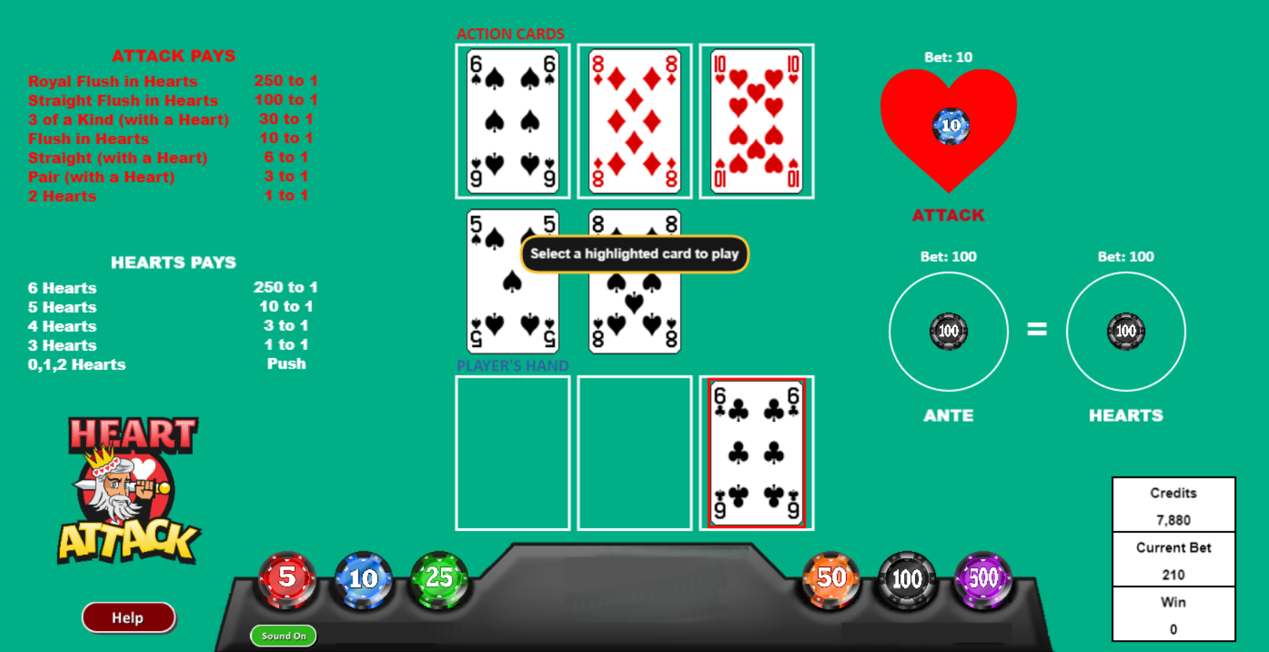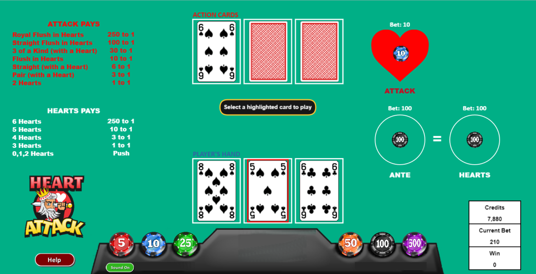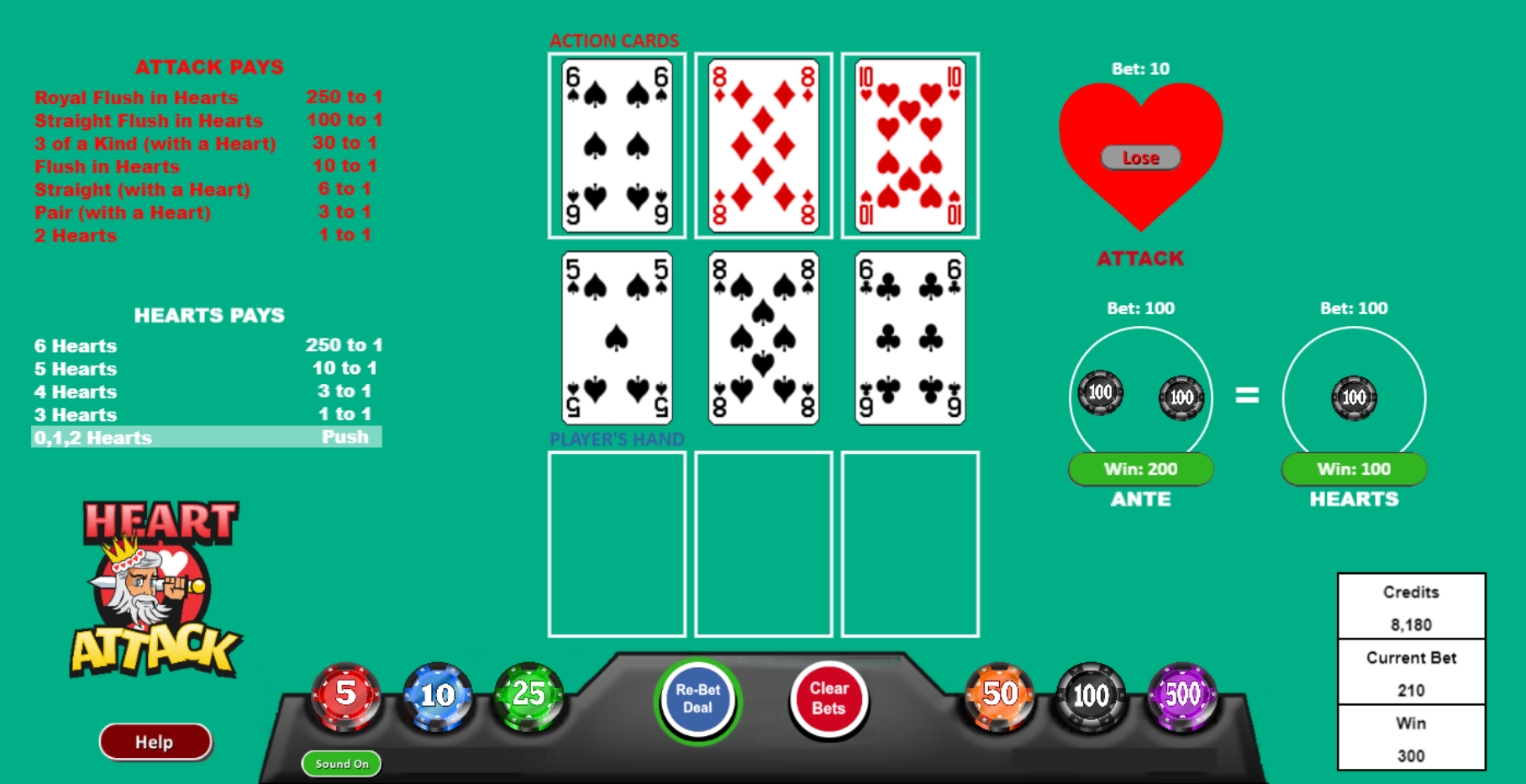 - O jogo começa com o jogador fazendo apostas iguais no Ante e no Hearts. O jogador também pode fazer a aposta paralela Attack neste momento.