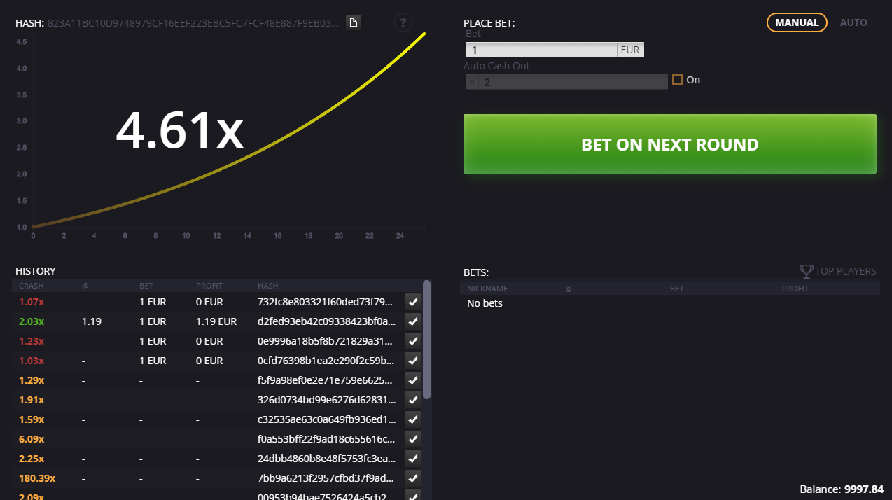 - O jogo garante a imparcialidade atribuindo um código hash a cada rodada, que o jogador pode verificar após a partida para confirmar se o resultado foi predeterminado antes de qualquer aposta ser feita.