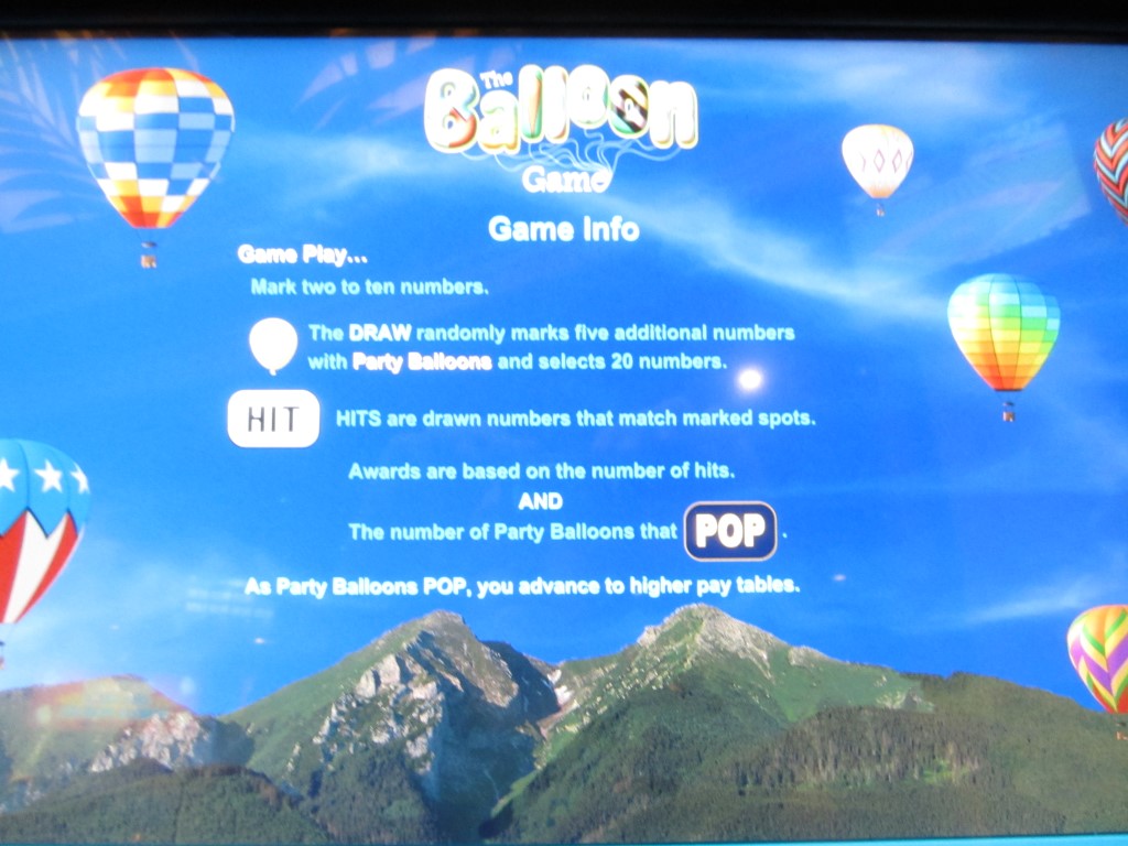 O Balloon Game é um jogo baseado no keno, encontrado em máquinas multijogos fabricadas pela U1 Gaming. Já vi essas máquinas nos cassinos Las Vegas Club, Rampart e Dotty's, em Las Vegas. O Balloon Game é semelhante ao Caveman Keno , exceto que utiliza cinco balões em vez de três ovos.