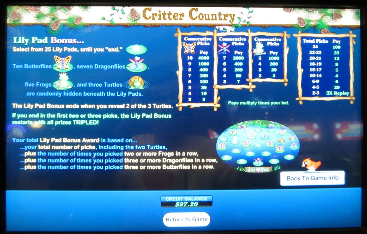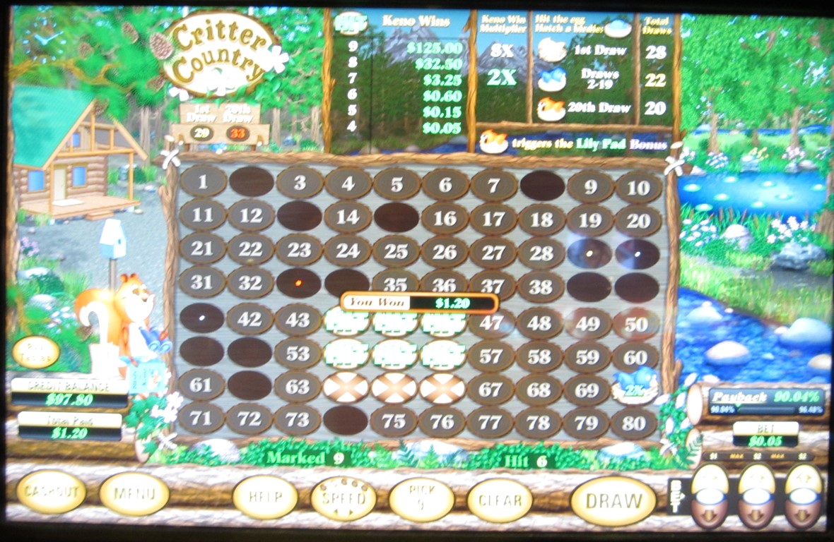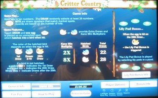 Critter Country é um jogo baseado em keno encontrado em máquinas multijogos fabricadas pela U1 Gaming. Já vi essas máquinas nos cassinos Las Vegas Club, Rampart e Dotty's em Las Vegas. A essência do Critter Country é que o jogo escolhe aleatoriamente um número não sorteado para colocar um ovo. Se um dos números sorteados acertar o ovo, o jogador pode ganhar multiplicadores, bolas extras ou uma rodada bônus.
