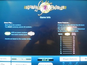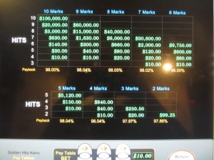 Golden Hits é um jogo baseado em keno encontrado em máquinas multijogos fabricadas pela U1 Gaming . Já vi essas máquinas nos cassinos Las Vegas Club, Rampart, El Cortez e Dotty's em Las Vegas. A ideia principal do Golden Hits é que, se o jogador não acertar nenhum número, o jogo sorteia de 16 a 24 bolas, dependendo do número de apostas feitas pelo jogador.