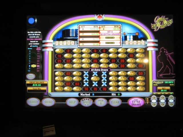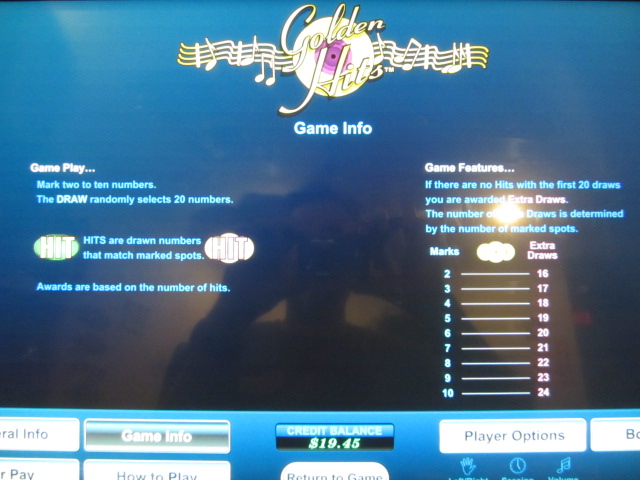 Golden Hits é um jogo baseado em keno encontrado em máquinas multijogos fabricadas pela U1 Gaming . Já vi essas máquinas nos cassinos Las Vegas Club, Rampart, El Cortez e Dotty's em Las Vegas. A ideia principal do Golden Hits é que, se o jogador não acertar nenhum número, o jogo sorteia de 16 a 24 bolas, dependendo do número de apostas feitas pelo jogador.