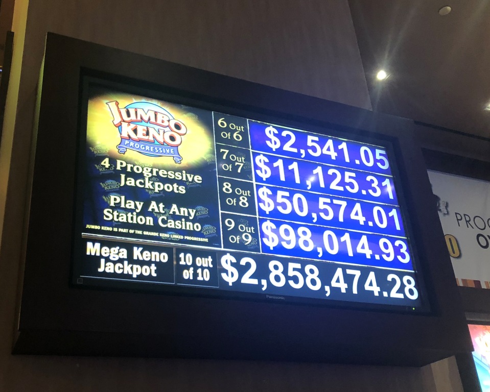 Os cassinos Stations de Las Vegas oferecem cinco jogos de keno progressivo. Quatro deles, um jogo de escolha de 6, 7, 8 e 9 números, são chamados de "Jumbo Keno Progressivo". O quinto, um jogo de escolha de 10 números, é conhecido como Mega 10. O regulamento indica que o Mega 10 não é exclusivo dos cassinos Stations, podendo ser encontrado em outros locais em Nevada. Todos os jogos Jumbo Progressivo são exclusivamente para apostas de US$ 1, e o Mega 10 é de US$ 1,50.