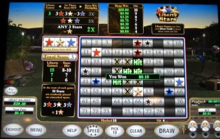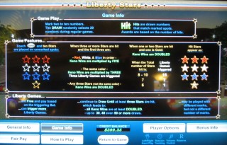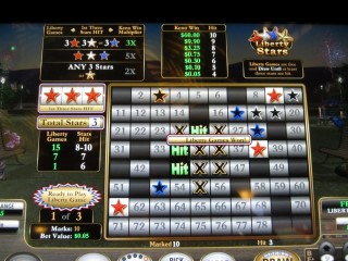 Liberty Stars é um jogo baseado em keno encontrado em máquinas multijogos fabricadas pela U1 Gaming . Já vi essas máquinas nos cassinos Las Vegas Club, Rampart, El Cortez e Dotty's em Las Vegas. A ideia principal do Liberty Stars é colocar aleatoriamente uma estrela em dez dos números não escolhidos pelo jogador. As estrelas podem ser vermelhas, brancas, azuis ou douradas. Se os 20 números sorteados pelo jogo corresponderem aos números das estrelas, o jogador pode ganhar multiplicadores ou jogos bônus.