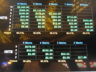 Por fim, como explicado nas regras, há um bônus acionado aleatoriamente que adiciona mais 0,5025% ao jogo. Assim, considerando todos os fatores, o retorno de uma aposta de $2 no Pick-10 é de 0,959759 + 0,005025 = 0,964784. De acordo com a tabela de pagamentos, a U1 Gaming obtém um retorno de 96,51%. Pessoalmente, não me preocupo com essa diferença de 0,03%.