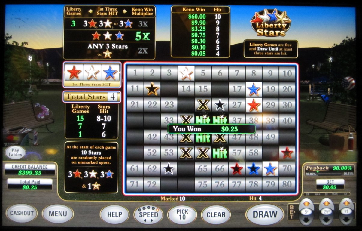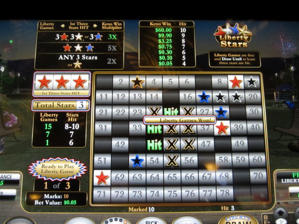 Liberty Stars é um jogo baseado em keno encontrado em máquinas multijogos fabricadas pela U1 Gaming . Já vi essas máquinas nos cassinos Las Vegas Club, Rampart, El Cortez e Dotty's em Las Vegas. A ideia principal do Liberty Stars é colocar aleatoriamente uma estrela em dez dos números não escolhidos pelo jogador. As estrelas podem ser vermelhas, brancas, azuis ou douradas. Se os 20 números sorteados pelo jogo corresponderem aos números das estrelas, o jogador pode ganhar multiplicadores ou jogos bônus.