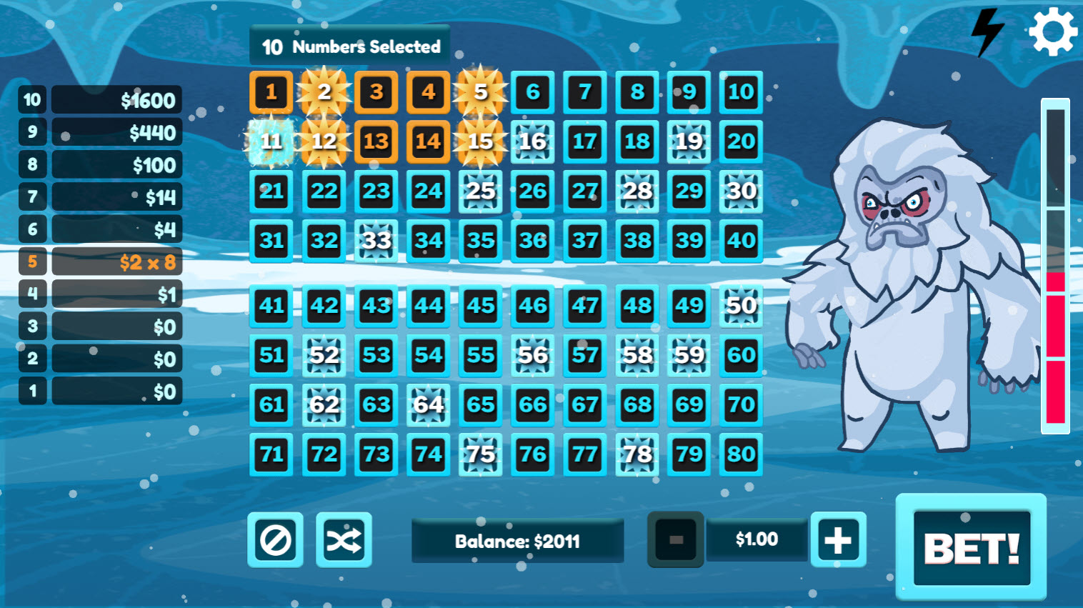 As regras do Mad Yeti Keno são as mesmas do keno tradicional, exceto que, se o jogador acertar a 20ª bola sorteada, seus ganhos serão multiplicados por 8. Em outras palavras, é igual ao Power Keno , só que os ganhos são multiplicados por 8 em vez de 4 se a última bola sorteada for acertada.
