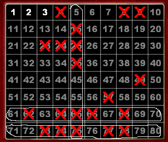 - Coluna : Uma linha reta que sobe e desce, por exemplo, aquela que engloba os números 3, 13, 23, 33, 43, 53, 63 e 73.