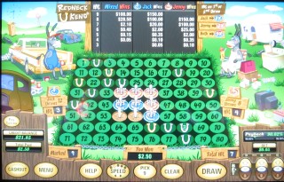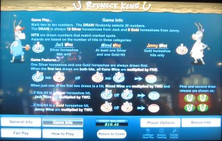 Redneck Keno é um jogo encontrado em máquinas multijogos fabricadas pela U1 Gaming. Já vi essas máquinas nos cassinos Las Vegas Club, Rampart e Dotty's em Las Vegas. A essência do Redneck Keno é que, em vez de 20 bolas, há 20 ferraduras, sendo 12 prateadas e 8 douradas. O jogador pode ser pago de três maneiras: de acordo com o número de ferraduras prateadas que correspondem às suas escolhas, de acordo com as ferraduras douradas que correspondem aos seus números e de acordo com a combinação de ambos os números.