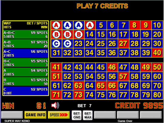 Super Way Keno é uma forma de jogar keno com sete cartelas, cada uma com 2 a 9 números escolhidos simultaneamente. O jogador escolhe quatro números para a cartela A, três para a cartela B e dois para a cartela C. O jogador também joga mais quatro cartelas, que combinam os números escolhidos em A+B, A+C, B+C e A+B+C.