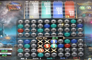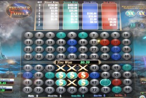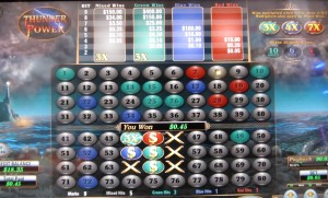 Thunder Power é um jogo baseado em keno encontrado em máquinas multijogos fabricadas pela U1 Gaming . Já vi essas máquinas nos cassinos Las Vegas Club, Rampart, El Cortez e Dotty's em Las Vegas. A essência do Thunder Power é que o jogo sorteia bolas de cores diferentes e, dependendo da quantidade de bolas de cada cor sorteadas e da combinação de cores, existem quatro maneiras diferentes de ganhar.