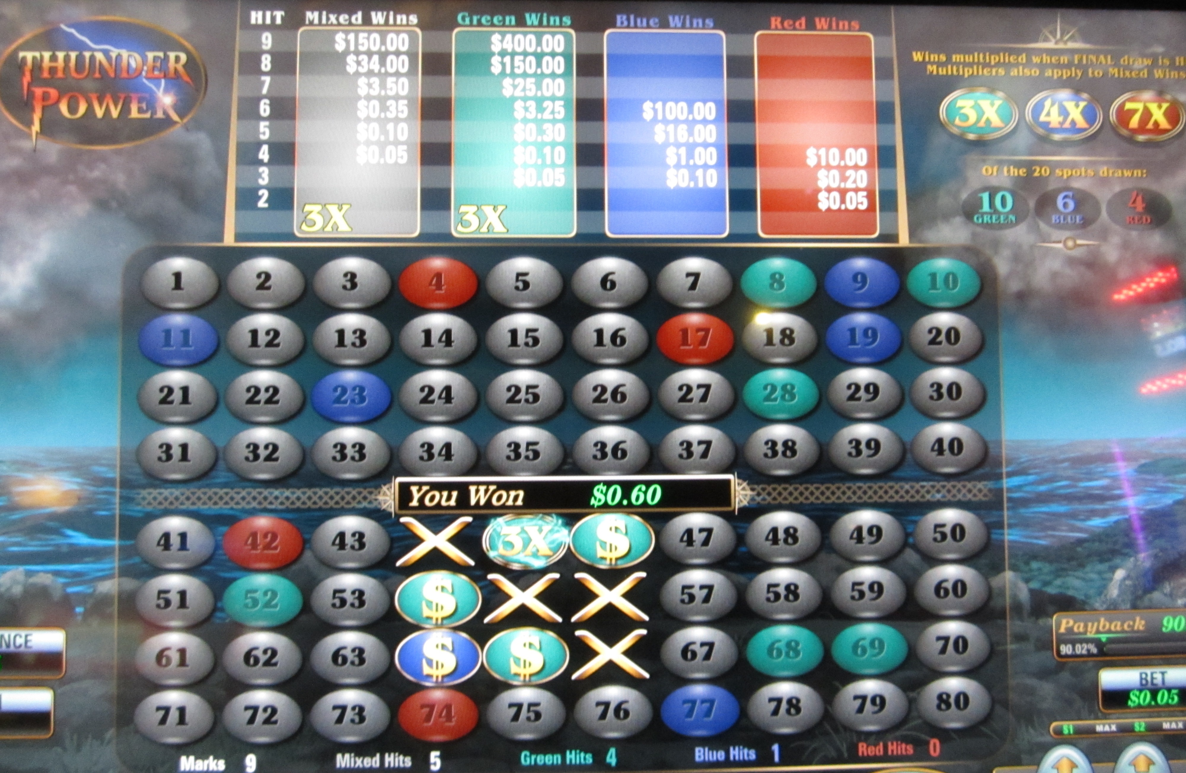 Thunder Power é um jogo baseado em keno encontrado em máquinas multijogos fabricadas pela U1 Gaming . Já vi essas máquinas nos cassinos Las Vegas Club, Rampart, El Cortez e Dotty's em Las Vegas. A essência do Thunder Power é que o jogo sorteia bolas de cores diferentes e, dependendo da quantidade de bolas de cada cor sorteadas e da combinação de cores, existem quatro maneiras diferentes de ganhar.