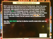 O Triple Diamond Keno é um jogo pouco conhecido baseado no keno, que existe desde 1996. Funciona como o keno tradicional, com a diferença de que o sorteio das bolas também pode revelar diamantes. Se três diamantes forem encontrados, o jogador ganha três vezes o valor da sua aposta, além de três rodadas grátis com um multiplicador triplicado.