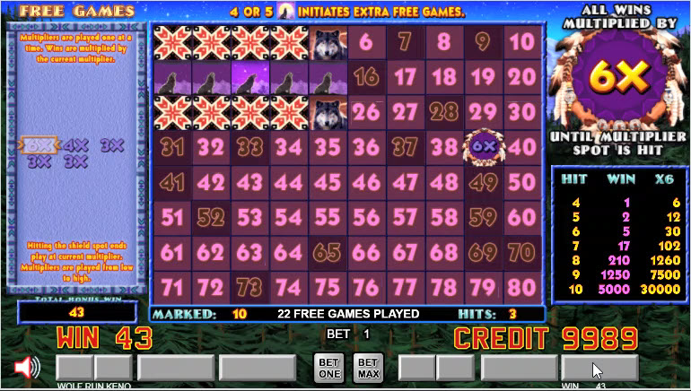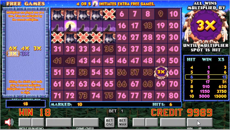 Wolf Run Keno é uma variante de keno da Action Gaming. O jogo apresenta um bônus de giros grátis com multiplicadores aleatórios, que pode durar por várias rodadas.