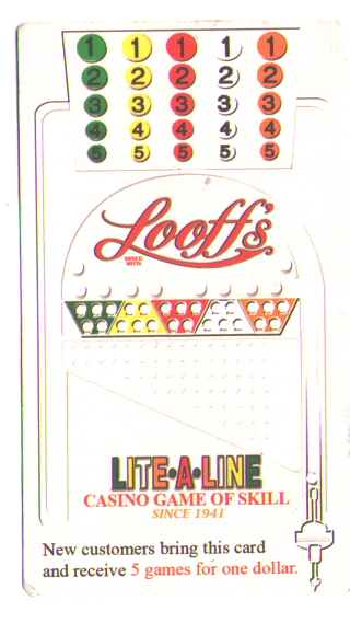 Lite-a-Line é uma combinação de pinball e bingo. É parecido com pinball por causa da forma como se usa um lançador para disparar uma bola em um tabuleiro, mas é como bingo porque o objetivo é que a bola destaque cinco espaços em linha para ganhar. À medida que a bola cai por 25 buracos no tabuleiro, as grades correspondentes em uma cartela de pontuação de cinco por cinco são iluminadas. Os jogadores geralmente apostam US$ 1, e o vencedor leva US$ 15.