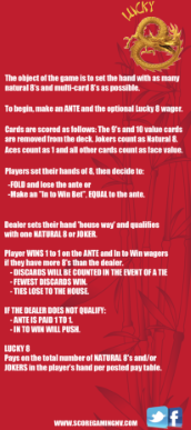 Vi Lucky 8's pela primeira vez em junho de 2016 no Venetian. É um jogo de mesa inovador, algo que não costumo dizer com frequência nesta era de jogos que copiam outros. A estrutura de apostas é semelhante à do Three Card Poker, com a opção de aumentar ou desistir, e o dealer precisa ter uma mão específica para se qualificar. No entanto, a pontuação é baseada no número de grupos de 8 pontos que podem ser formados com oito cartas.