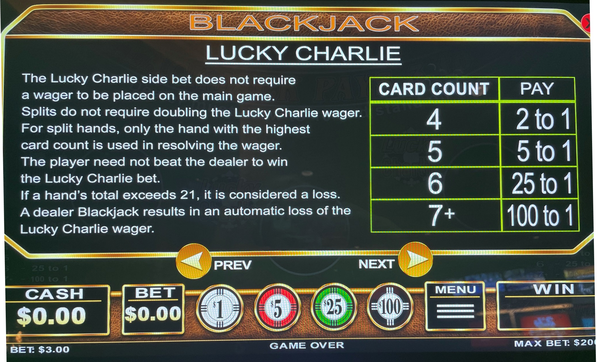 A seguir, apresentamos as regras da aposta paralela Lucky Charlie. A descrição pressupõe que o leitor já esteja familiarizado com a terminologia do blackjack.