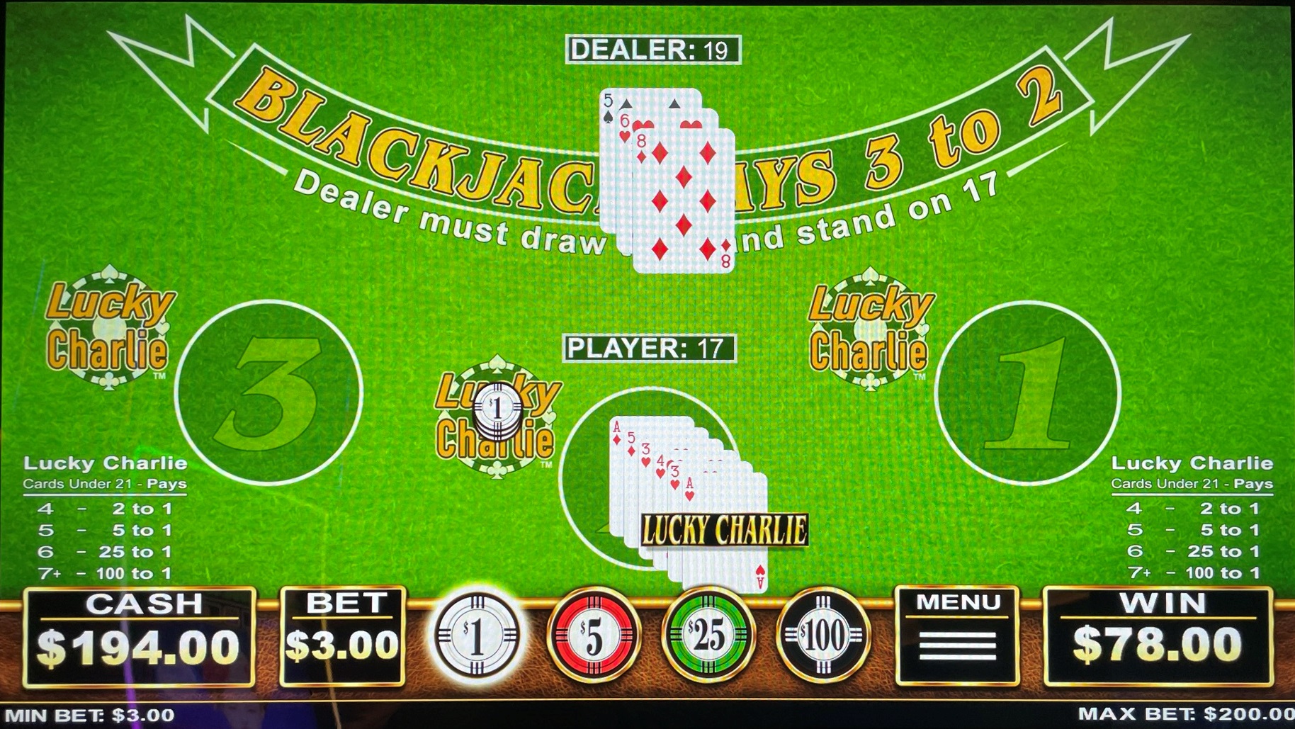 O jogo "Six-card Charlie" paga 25 para 1. Vale ressaltar que as probabilidades favorecem um total de 17 com as seis cartas.