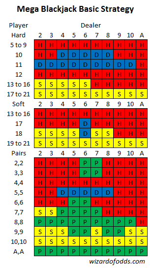 A tabela a seguir mostra a estratégia básica para o Mega Blackjack.
