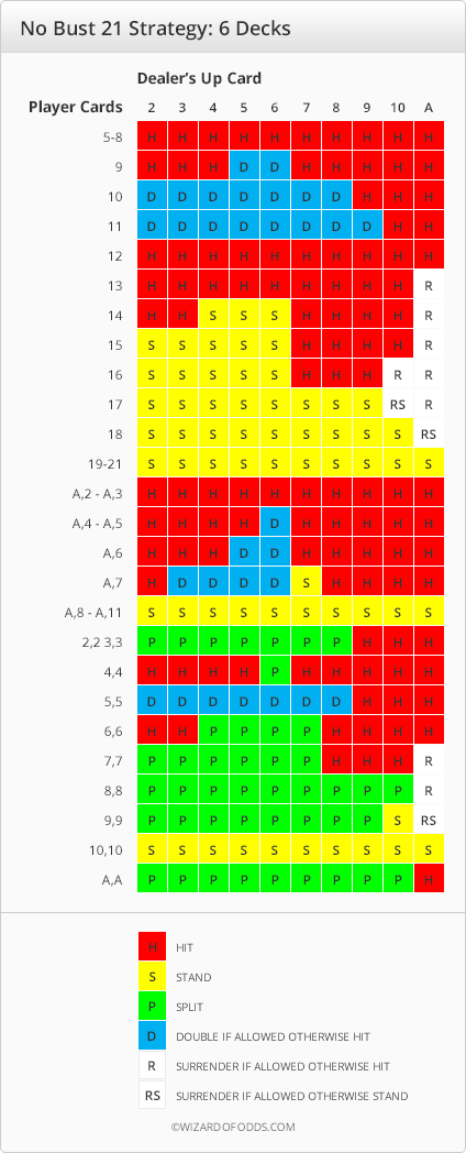 A tabela a seguir mostra como jogar qualquer mão, com base em um jogo de seis baralhos. A mão do jogador está na coluna da esquerda e a carta aberta do carteador está na linha superior.