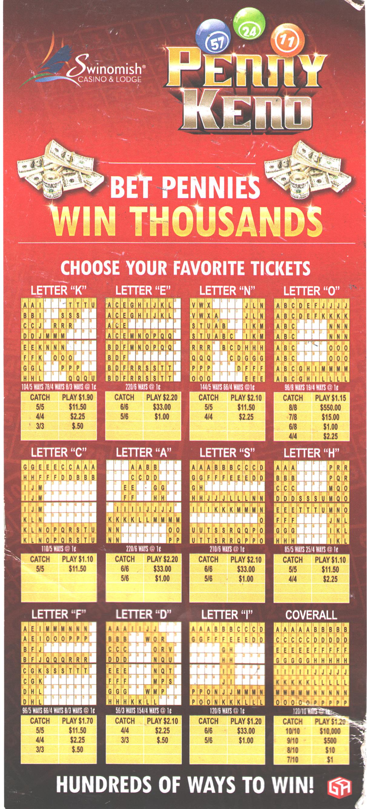 Penny Keno é um formato de jogo de keno com várias cartelas que vi no cassino Swinomish em Anacortes, Washington, em julho de 2023. É basicamente o keno normal, exceto que o jogador compra de 110 a 220 cartelas de $0,01 por vez. O jogo oferece ao jogador 12 padrões diferentes para escolher na disposição das cartelas.