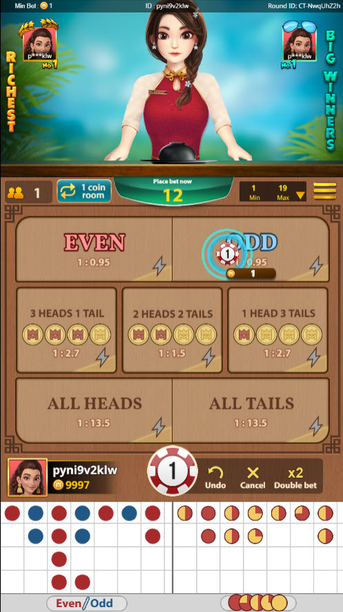 O jogador pode apostar em qualquer resultado entre cara e coroa, bem como na aposta de 50/50 sobre se a soma dos números de cada lado será par ou ímpar. Aqui estão as apostas específicas.