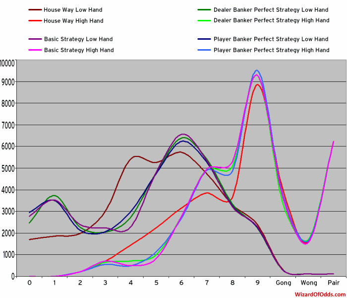 O gráfico a seguir mostra a frequência com que cada tipo de mão é formada no Foxwoods, bem como a estratégia perfeita e a estratégia básica (incluindo as exceções) quando o dealer está bancando e quando o jogador está bancando: