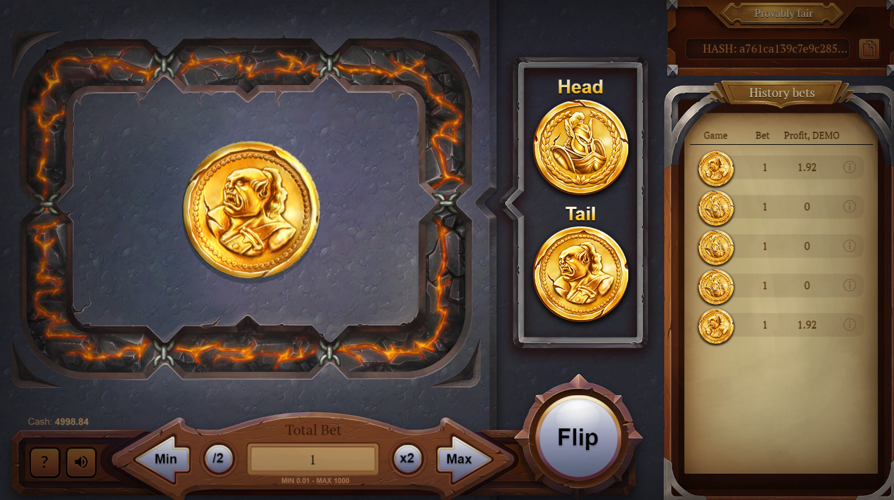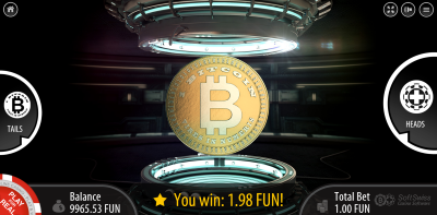 O jogador faz uma aposta e depois prevê o resultado do lançamento de uma moeda — um Bitcoin, para ser mais específico. O prêmio é de 198 para cada 100 apostados.
