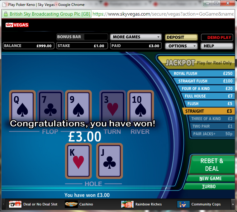 Poker Keno é um jogo simples, baseado no pôquer, disponível no cassino online Sky Vegas. O jogador faz uma aposta e recebe sete cartas, no estilo Texas Hold'em. Ele ganha se tiver pelo menos um par de valetes. Não tenho certeza da relação com o keno, talvez pelo fato de não exigir nenhuma habilidade. É um jogo puramente de sorte.