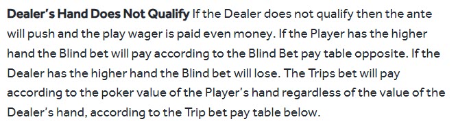 Em 31 de maio de 2024, alguém postou no meu fórum que os cassinos Genting no Reino Unido não seguem as regras convencionais. Em vez disso, eles pagam automaticamente a aposta Play com o valor da aposta igual ao apostado se o dealer não se qualificar. Ele forneceu um link para as regras no site do cassino para comprovar sua afirmação. Apresento uma captura de tela das regras abaixo.