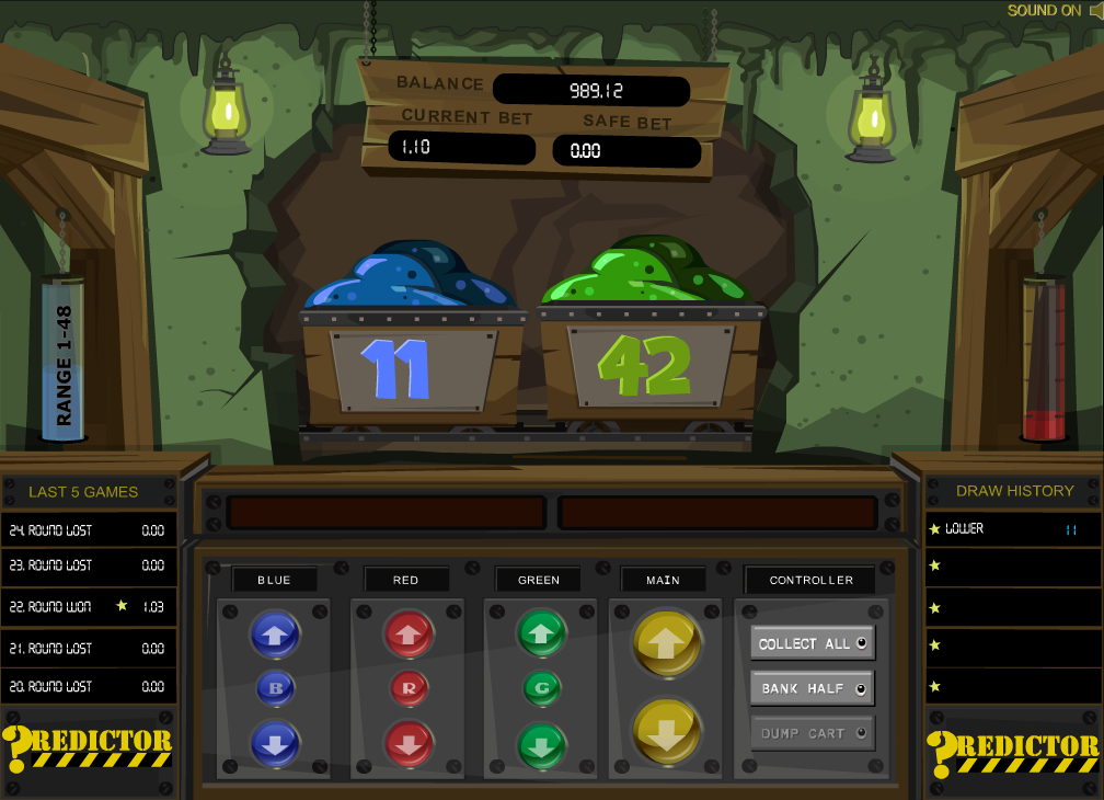 - O jogador pode desistir ou "depositar metade" a qualquer momento. Isso significa recolher metade do saldo atual e apostar a outra metade.
