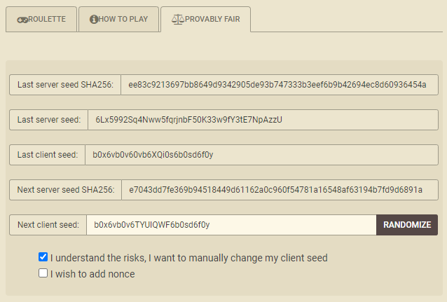 Você decide se quer adicionar um Nonce, que são caracteres extras automatizados adicionados ao final da Semente do Cliente. Acredito que, se o cassino tiver a intenção de trapacear, adicionar um Nonce não oferecerá nenhuma proteção.