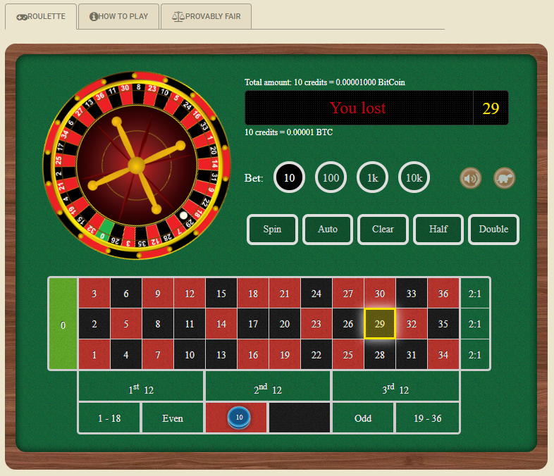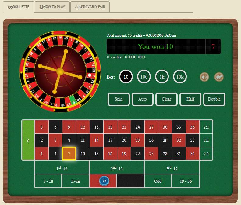 No caso do jogo da Crypto.Games, a roleta é jogada em uma roda com um único zero, como é comum em cassinos online. A vantagem da casa é de 1/37 = 2,70% em cada aposta.Jogo Justo