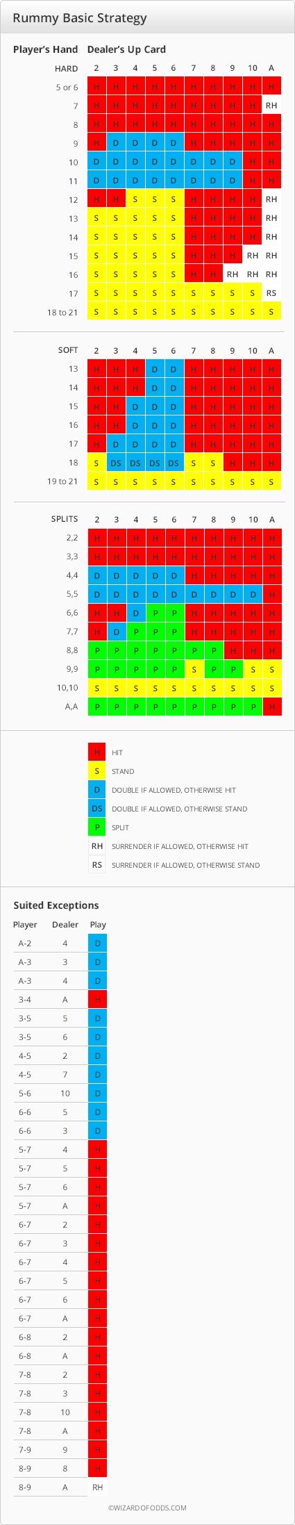 A tabela a seguir mostra a estratégia básica, considerando as regras acima. Observe as exceções de bônus para duas cartas de jogador do mesmo naipe à direita da tabela.