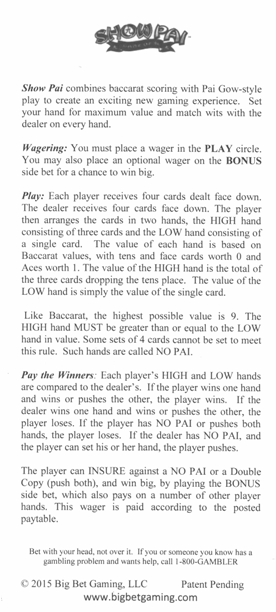 Show Pai é um jogo de mesa bastante simples que combina a pontuação do bacará com o formato do pai gow . O jogo estreou no Palace Station de Las Vegas no início de 2016. É fácil de aprender e jogar, e oferece uma vantagem da casa relativamente baixa.