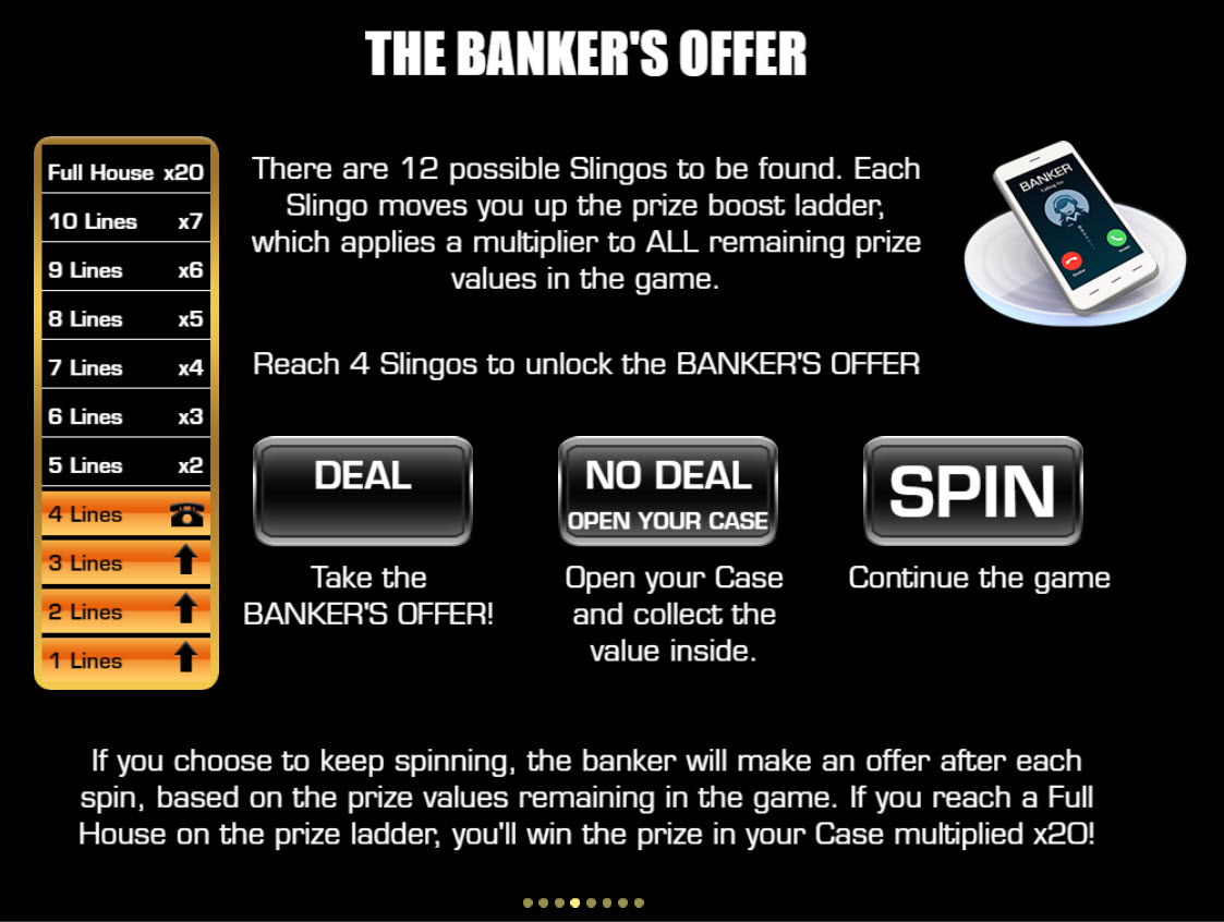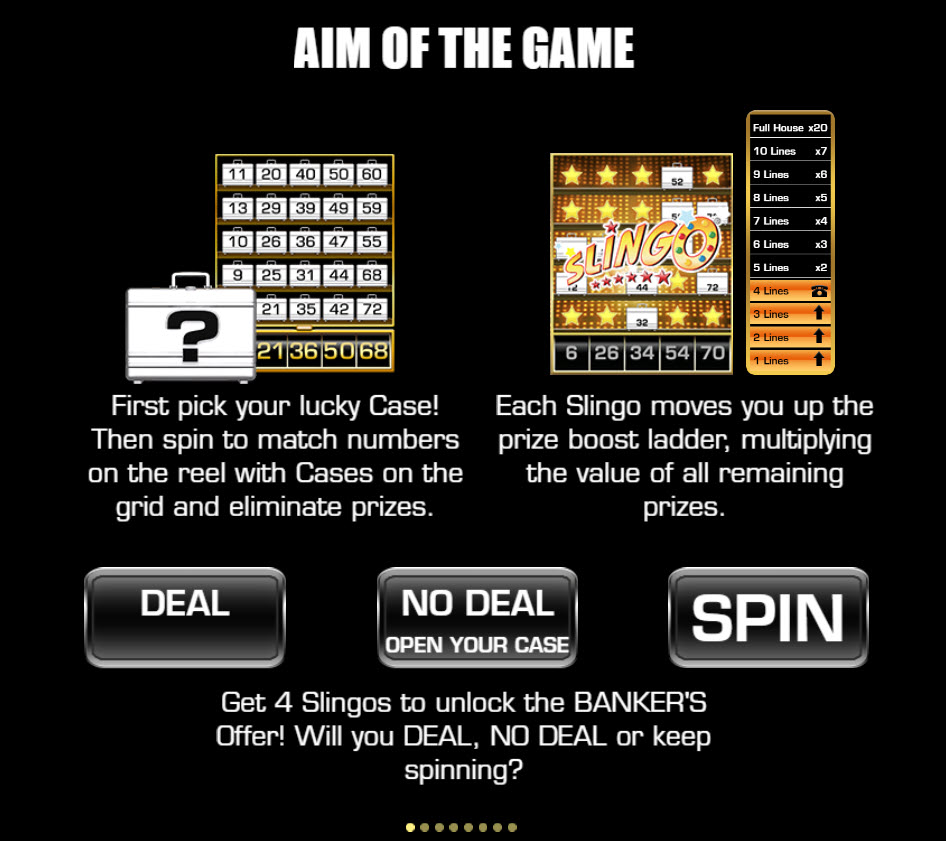 O que você obtém ao cruzar Deal or No Deal com Bingo? Você obtém Slingo Deal or No Deal. Este é um jogo emocionante, baseado principalmente na sorte, onde uma aposta dura bastante tempo (cerca de 1 minuto e 45 segundos até a primeira oportunidade de sair). Esteja avisado: o jogo o tentará a continuar jogando, o que pode ficar caro com a compra de rodadas extras.