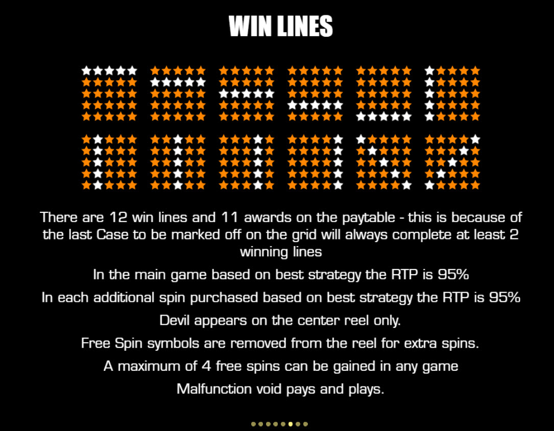 As telas de ajuda indicam que o RTP (Retorno ao Jogador) é de 95% em todas as apostas realizadas. Isso inclui a aposta inicial, a aceitação de ofertas do banqueiro e a taxa para rodadas extras. Acredito que isso seja verdade. Sem saber a probabilidade dos curingas, do diabo e das rodadas grátis, eu teria poucas maneiras de analisar o jogo por conta própria.