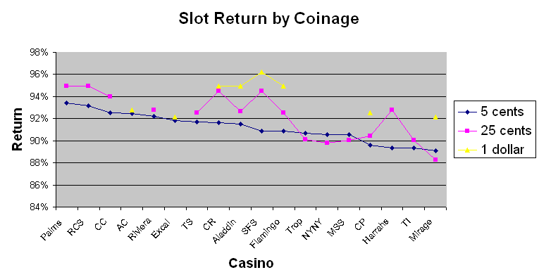 O gráfico a seguir mostra o retorno de cada moeda em cada cassino. Este gráfico parece corroborar uma correlação geral entre o retorno das moedas de 5 centavos e de 25 centavos, embora não seja uma correlação forte. Há também uma correlação aproximada entre as moedas de 25 centavos e de 1 dólar, com exceção do Arizona Charlie's e do Excalibur.