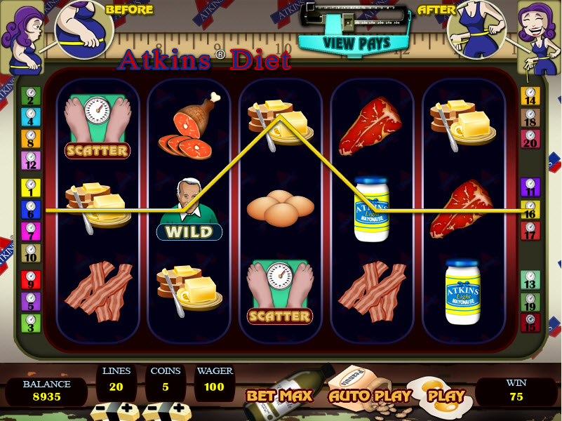 A próxima tabela mostra a tabela de pagamentos da Dieta Atkins. Todas as combinações vencedoras devem estar alinhadas à esquerda. O símbolo da Dieta Atkins é curinga e pode substituir qualquer símbolo, exceto a balança.