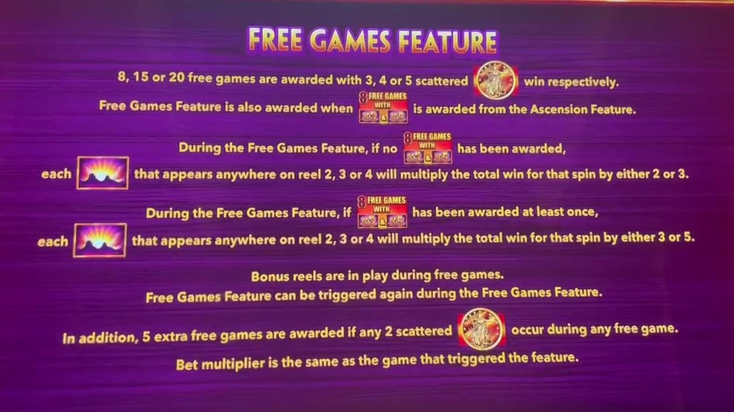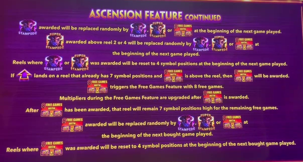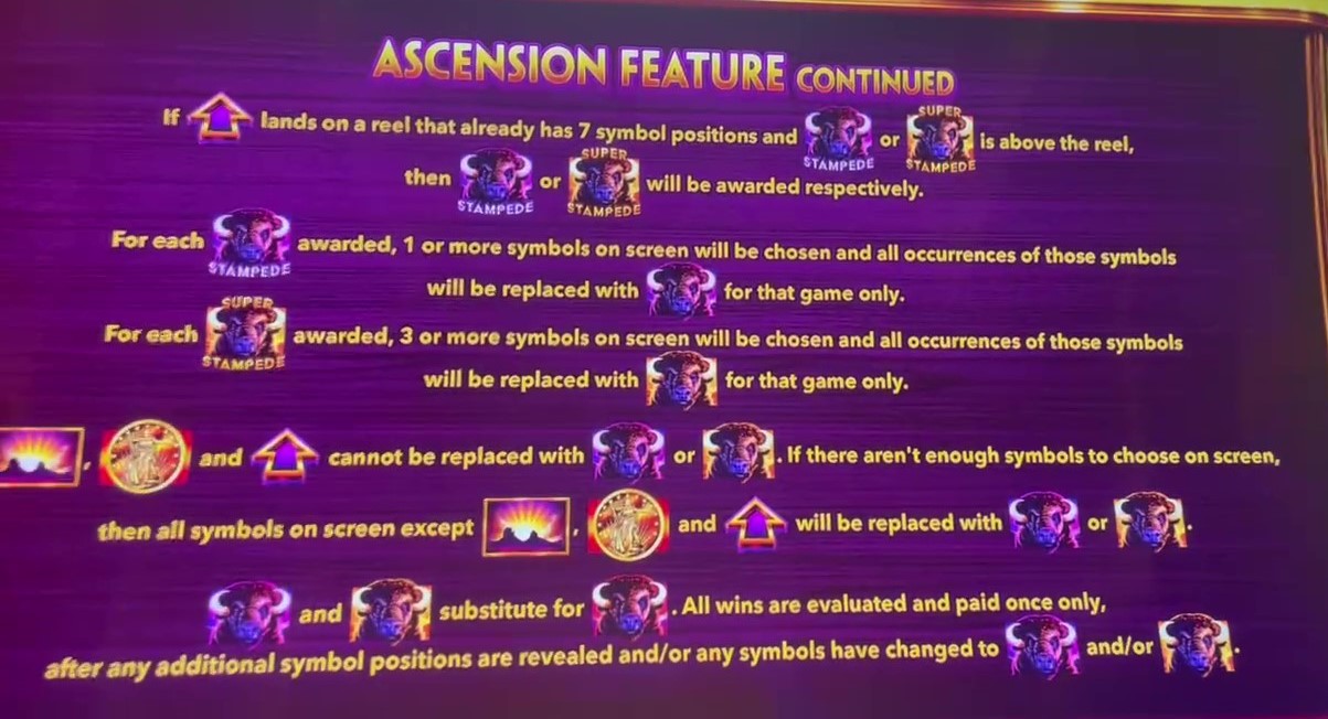 Buffalo Ascension é um dos muitos jogos com tema de búfalo. O que o diferencia é que o número de posições exibidas nos cilindros 2 a 4 pode variar de 4 a 7. Quanto maior a pilha de símbolos, mais maneiras de ganhar e mais perto você está de um bônus.