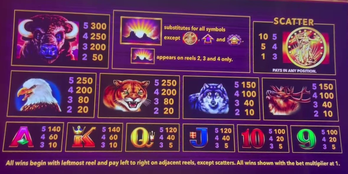 - Os símbolos de pagamento por linha são o búfalo, a águia, o puma, o lobo, a rena, A, K, Q, J, 10 e 9.