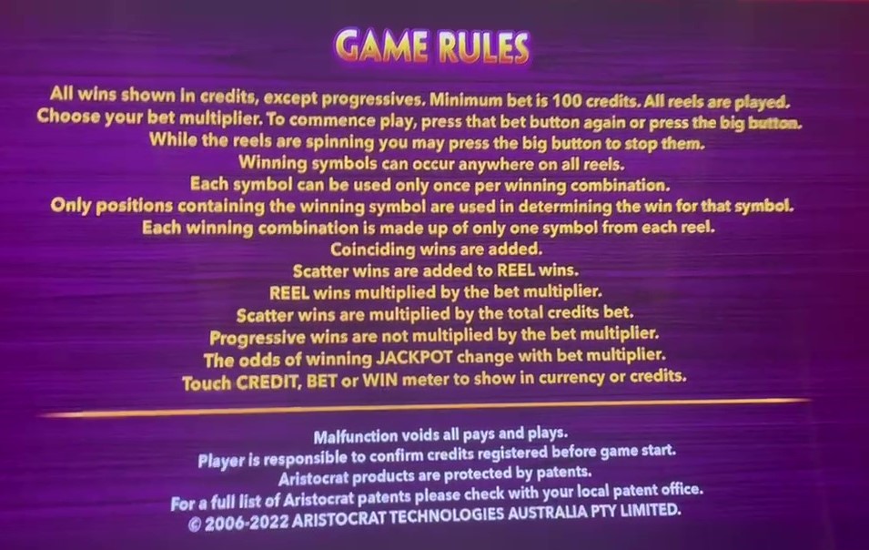 - Todos os ganhos são proporcionais ao valor do crédito, exceto o jackpot progressivo.