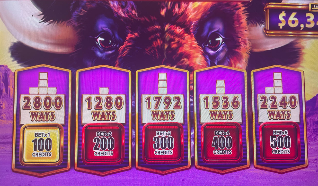 Aqui está um exemplo da regra das "formas de ganhar". Nas imagens abaixo (após uma debandada), há 1, 4, 2, 2 e 1 búfalo nos cilindros 1 a 5, respectivamente. Isso resulta em 1 × 4 × 2 × 2 × 1 = 16 formas de ganhar. Cinco búfalos pagam 300 créditos, então o prêmio total foi de 16 × 300 = 4800 créditos, ou US$ 48.
