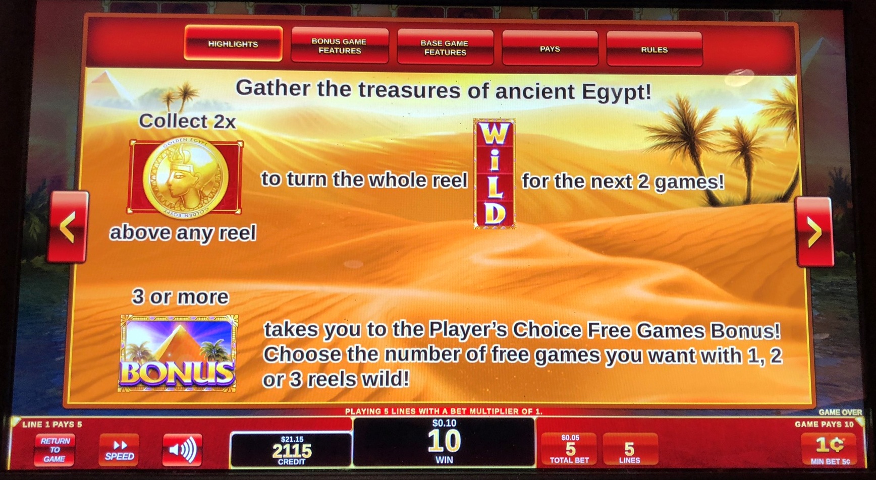 Golden Egypt é o que alguns chamariam de slot machine de "estado variável" da fabricante IGT. Caracteriza-se por símbolos de moedas que transformam os rolos completamente em curingas. Se o jogador anterior abandonar o jogo com moedas suficientes, as probabilidades mudarão temporariamente a favor do próximo jogador.
