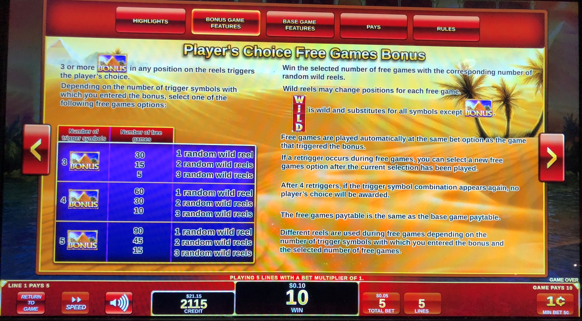 - Se três ou mais símbolos de pirâmide dispersos aparecerem na tela, o jogador participará de um jogo bônus de giros grátis com rolos curinga aleatórios.
