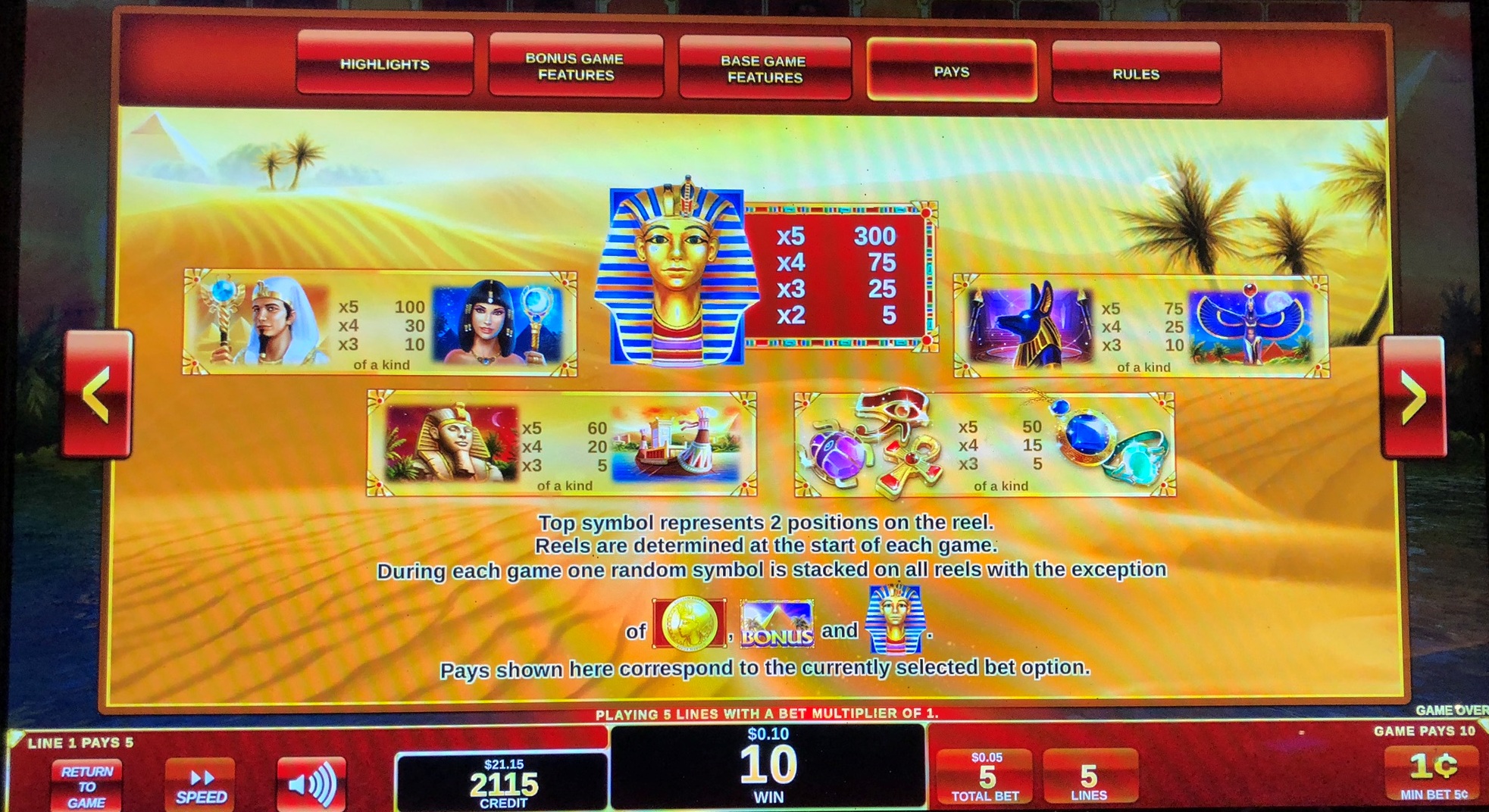 Primeiramente, gostaria de esclarecer um ponto importante. Esta análise é baseada em uma simulação de um jogo que criei, inspirado no Golden Egypt, de acordo com minha experiência jogando, assistindo a vídeos no YouTube e considerando as normas da indústria de design de máquinas caça-níqueis. Meu jogo tem como base um retorno geral de 86%, uma estimativa conservadora do que as máquinas caça-níqueis pagam em todo o país. Portanto, gostaria de enfatizar que as dicas a seguir não se baseiam em um jogo real de Golden Egypt, mas sim na minha melhor estimativa. Assim, leve minhas dicas com cautela.