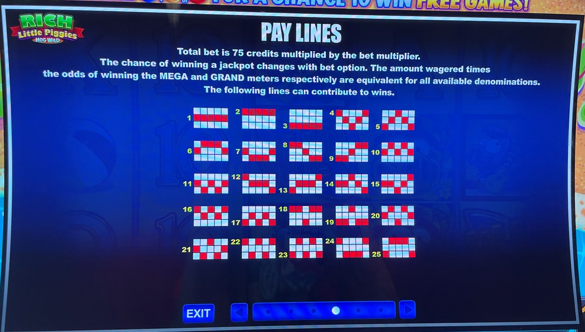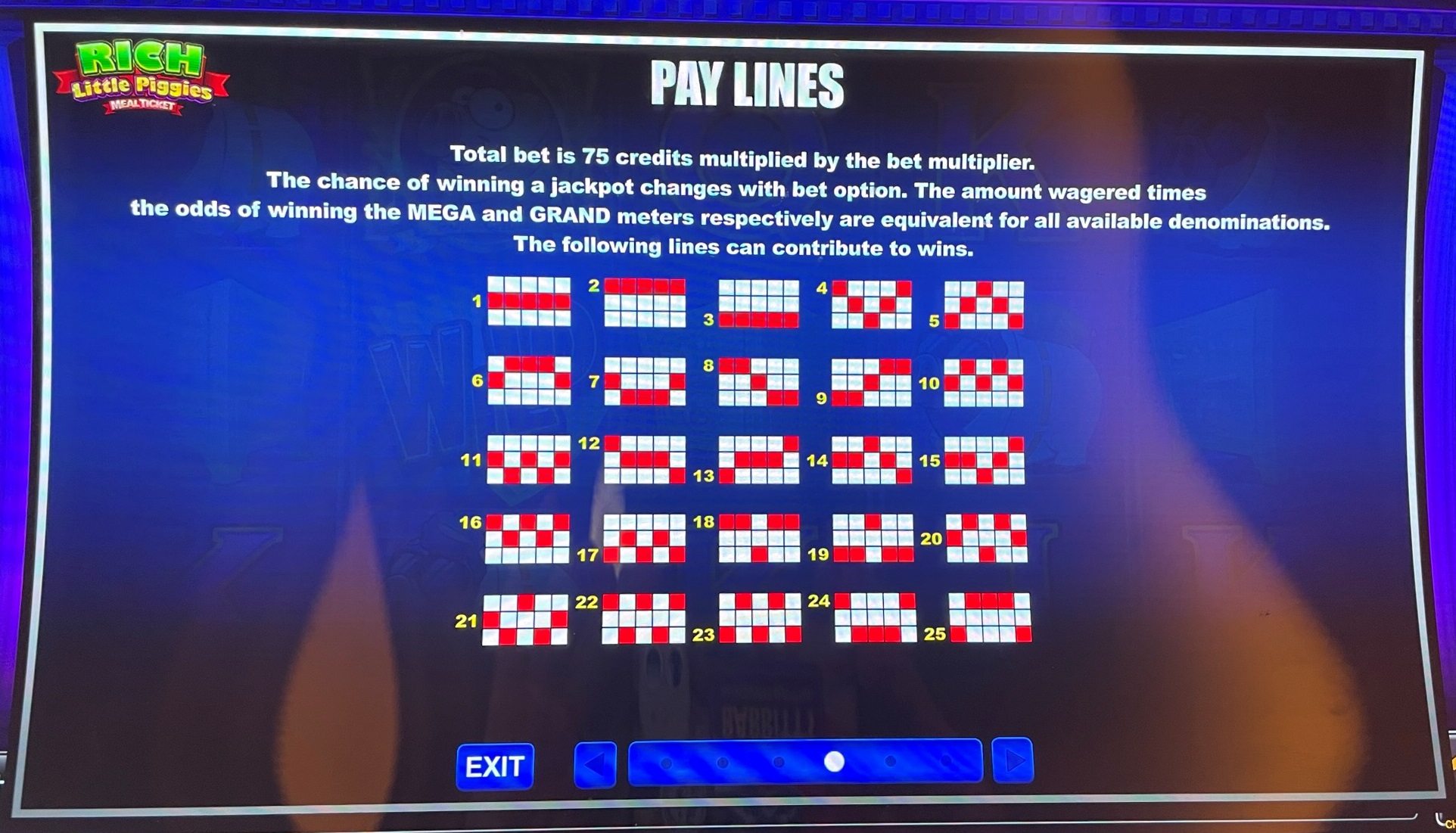 - Existem 25 linhas de pagamento. Dividindo a aposta total por 25 linhas de pagamento, o valor em créditos apostado por linha é 3, 6, 9, 18 ou 24.