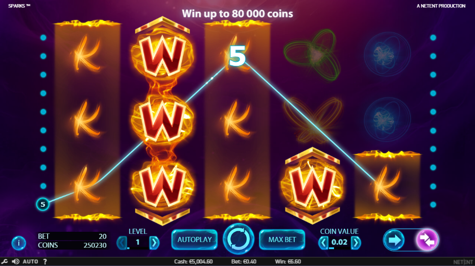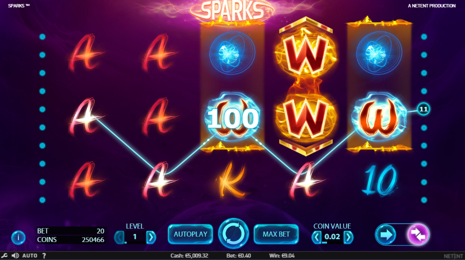 Sparks é uma slot machine com uma inovação inteligente da NetEnt. À primeira vista, parece uma slot de vídeo padrão com os usuais cinco rolos e três posições por rolo. A novidade de Sparks está nos wilds expansíveis e clonáveis.