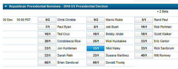 Por exemplo, considere estas probabilidades da William Hill para o candidato republicano à presidência em 2016 (obtidas em 3 de agosto de 2014 - observe que Trump pagou 66 para 1).