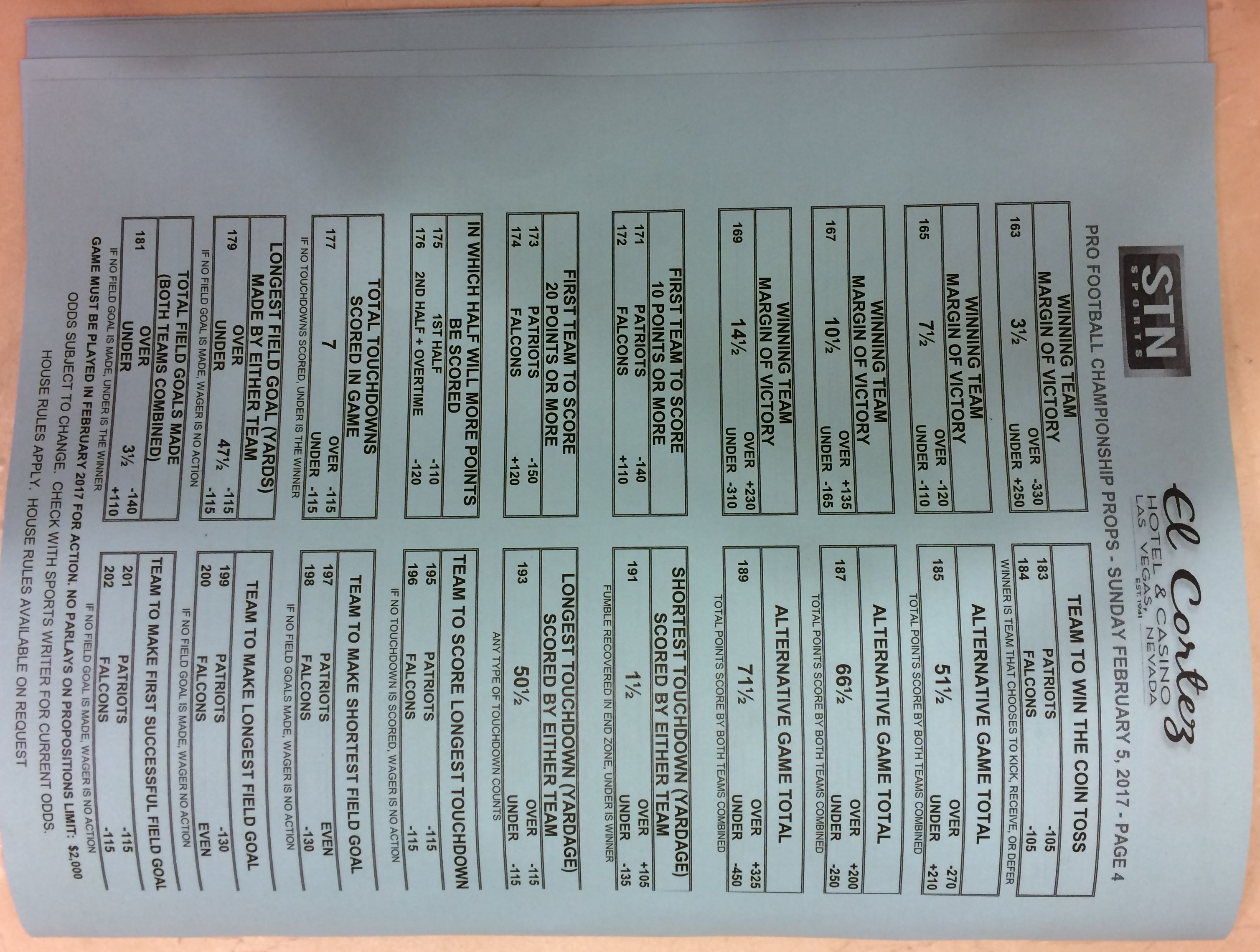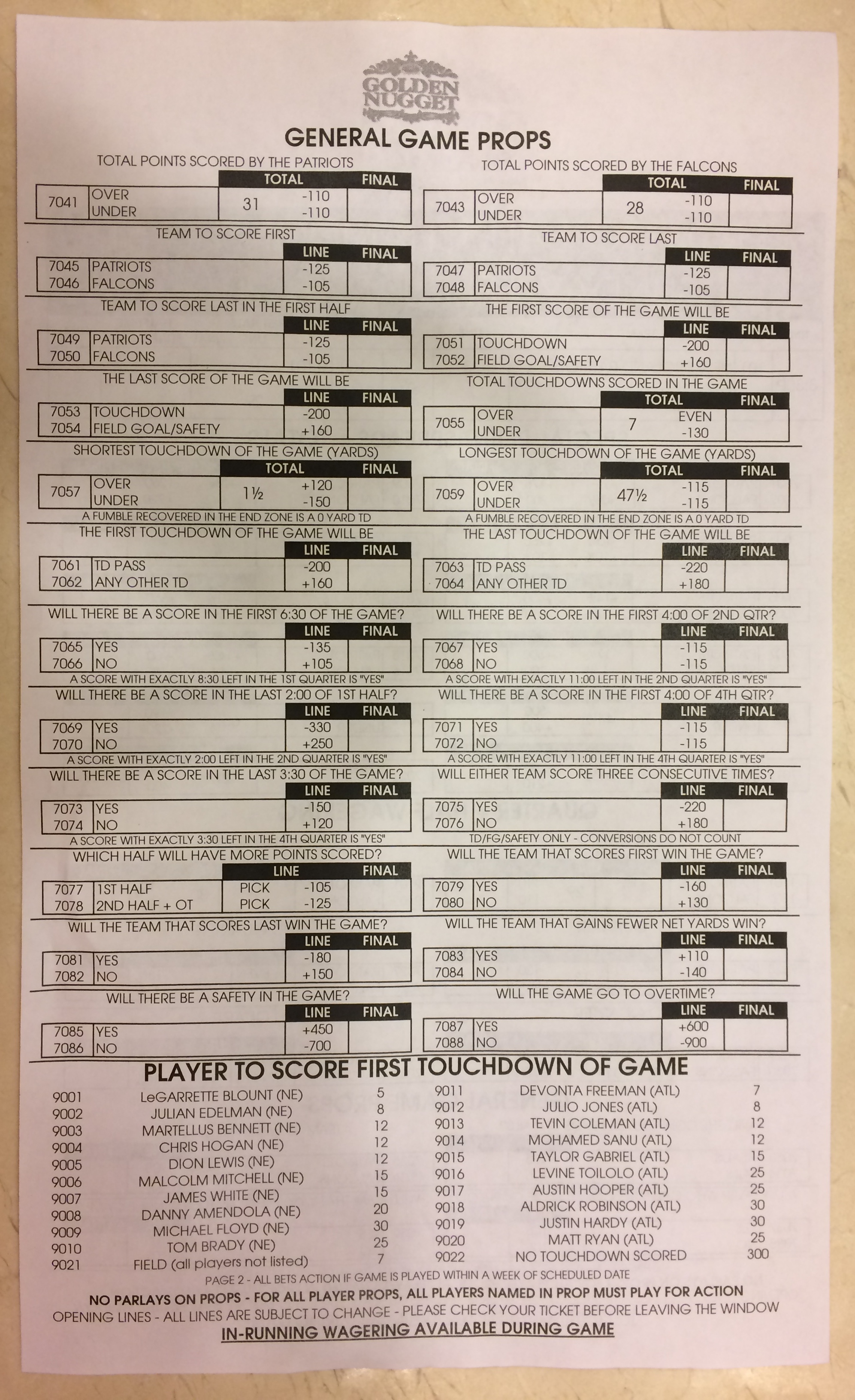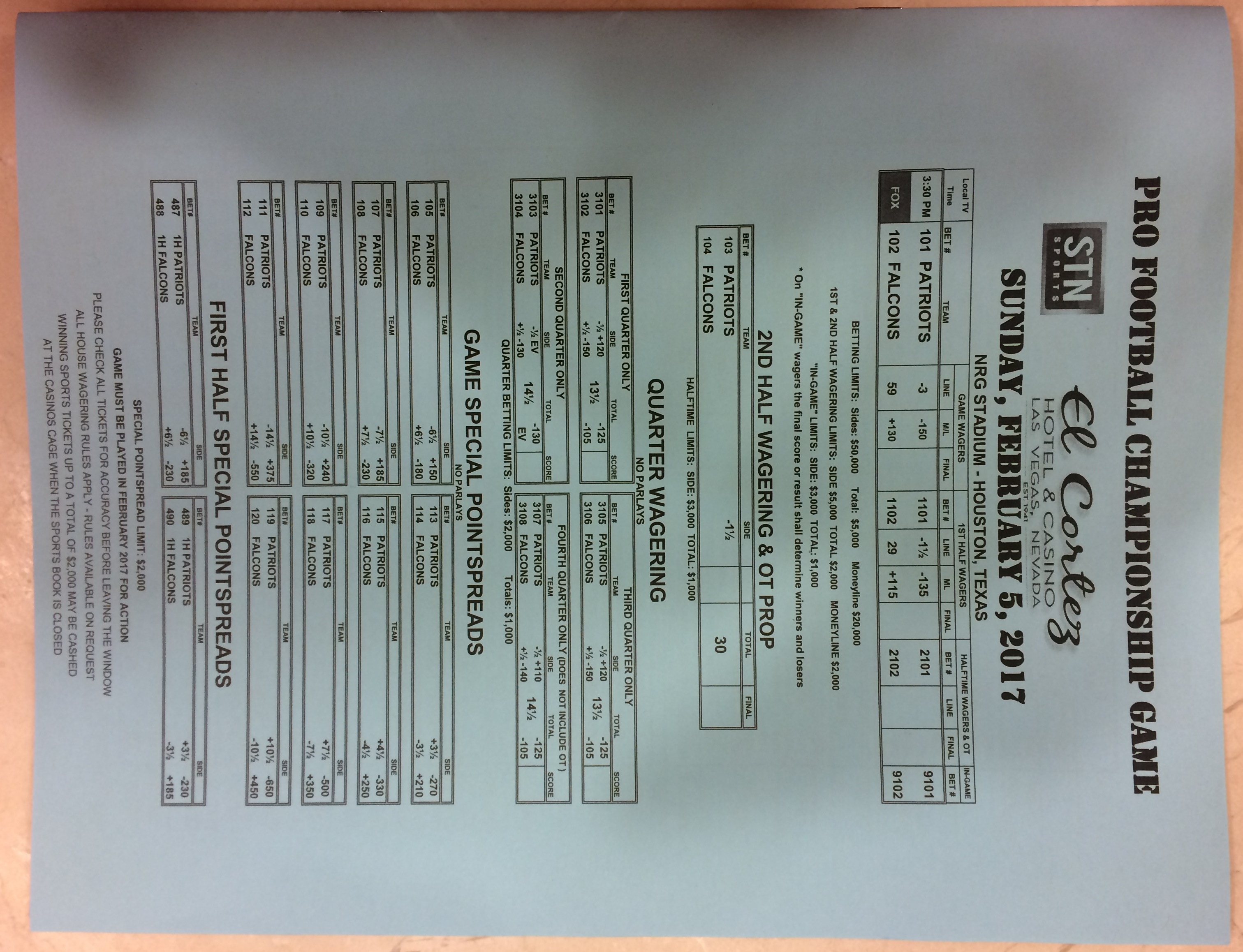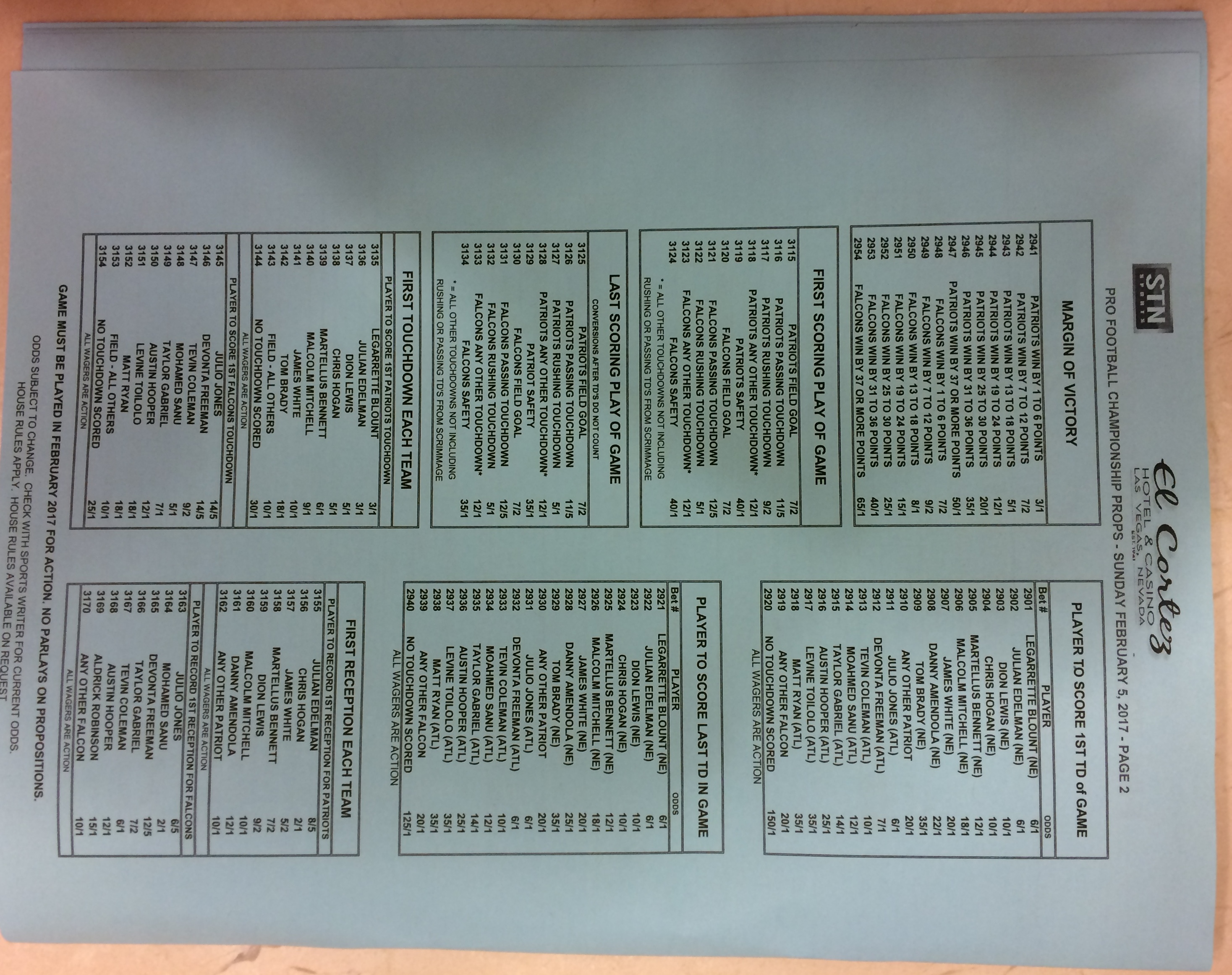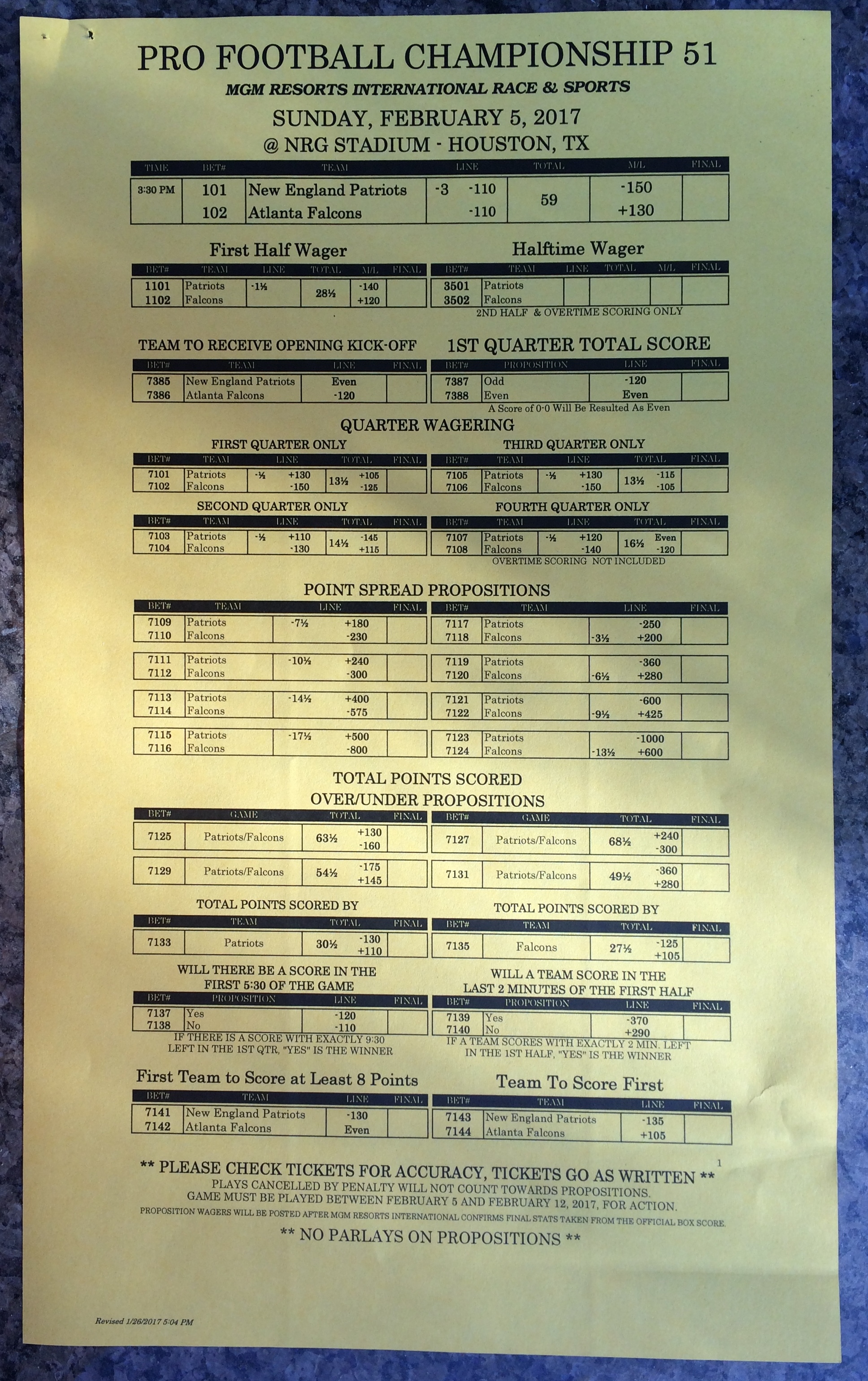 Embora eu não vá dar nenhum palpite este ano, você pode pelo menos ver o que está disponível. Aqui estão algumas imagens de planilhas de apostas para o Super Bowl 51. Mais devem aparecer nos dias que antecedem o jogo.
